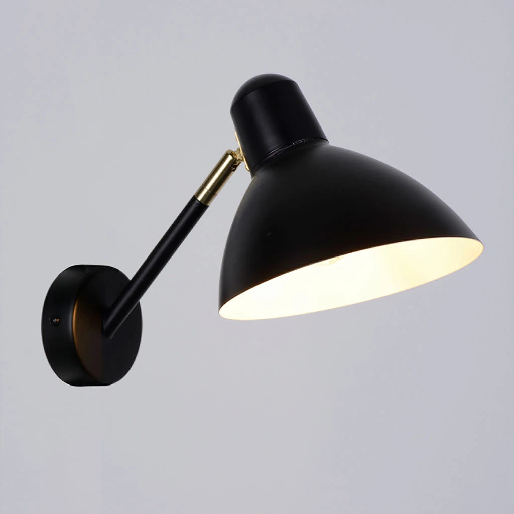 Applique design style années 50. Base ronde en métal avec finition laiton. Abat-jour orientable en métal peint. Coloris : noir. IP20. H19cm-L17cm-P26cm. Classe 2. E14-40W.