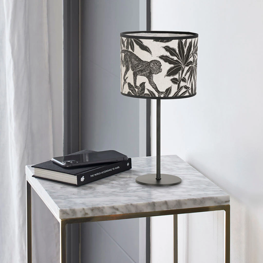 Lampe base ronde en métal peint. Abat-jour cylindre en coton imprimé. Coloris : sapajou. IP20. D18cm – H36cm. Classe . E14-40W.