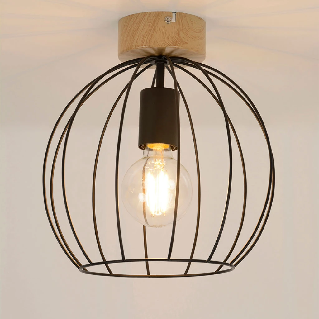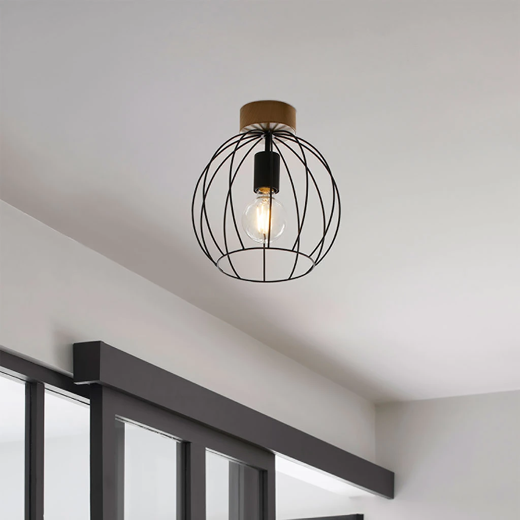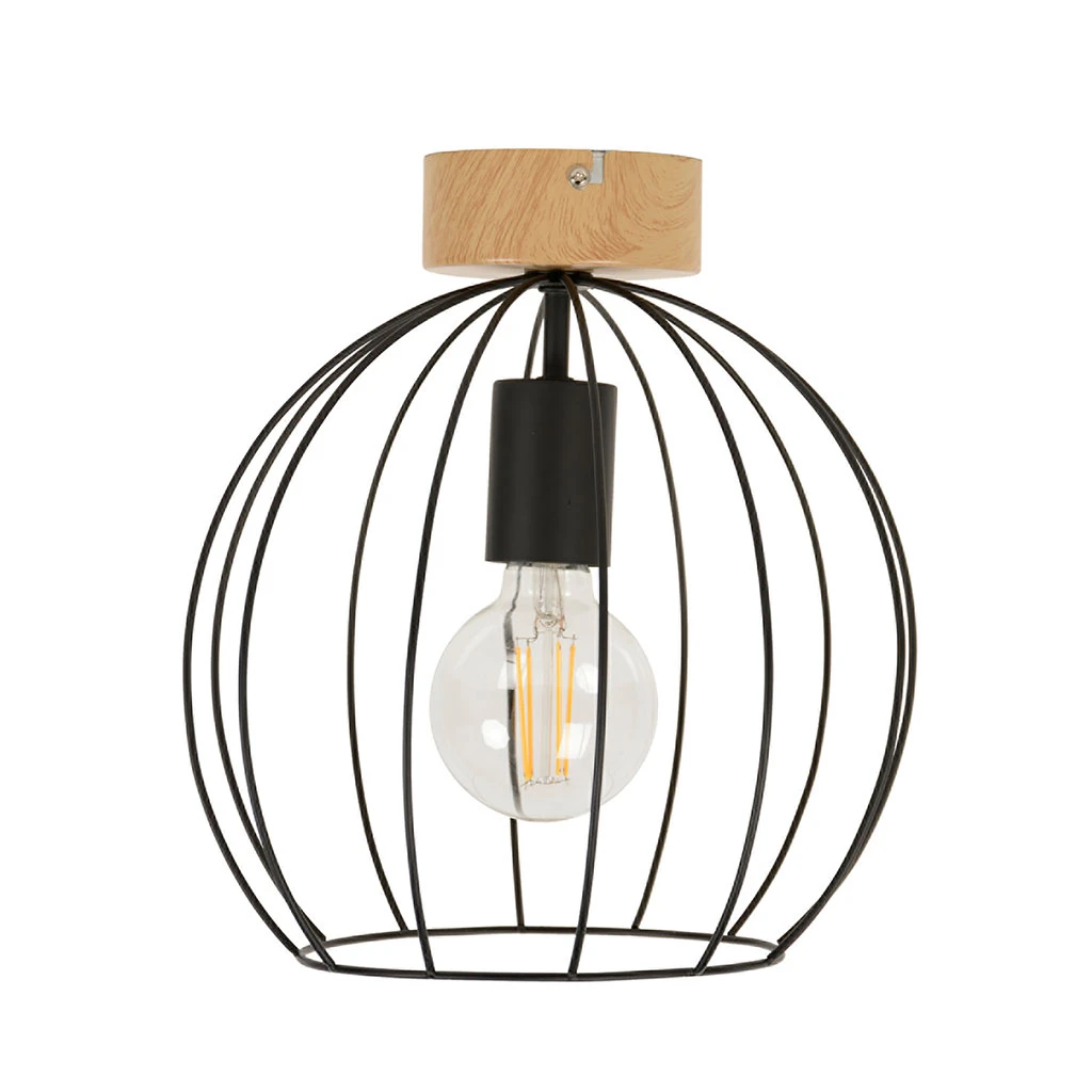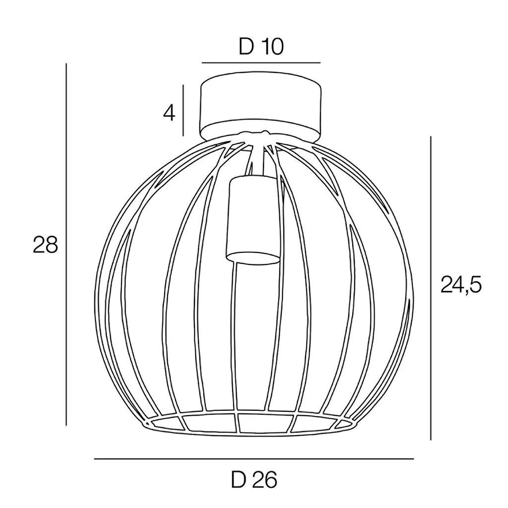 Plafonnier en métal filaire peint. Équipé d’un cache douille et d’un pavillon en métal assorti. Adaptable DCL. Coloris : bois foncé. IP20. D26cm – H24,50cm – HT28cm. Classe 1. E27-40W.