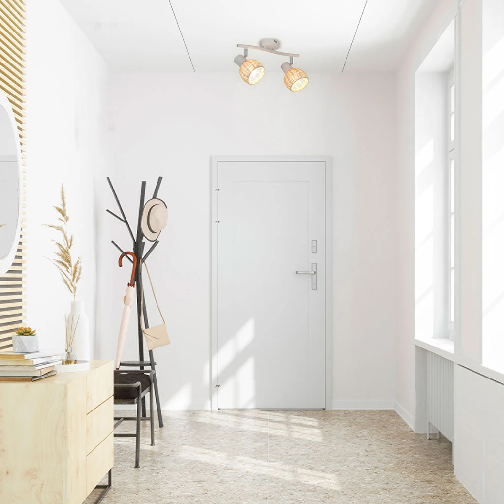 Spot 2 lumières base métal, têtes articulées forme boule en rotin tressé à la main. Coloris : naturel. IP20. L33cm – H14cm – P15cm. Classe 1. E14-40W.