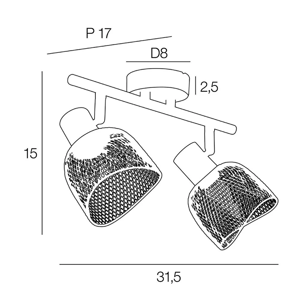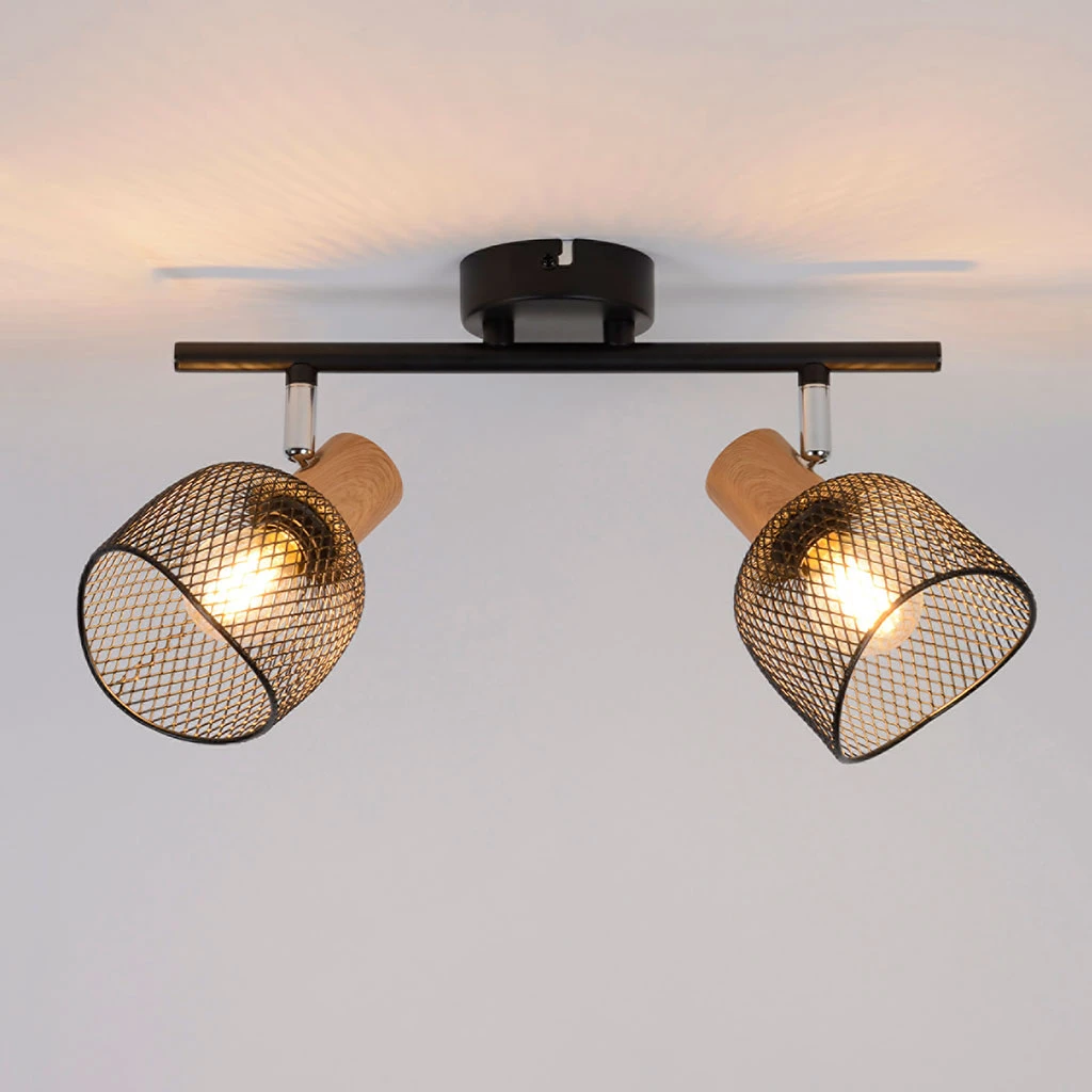 Spot 2 lumières base ronde en métal et finition bois. Abat-jour en métal grillagé peint. Têtes orientables. Coloris : blanc. IP20. H15cm-L31,50cm-P17cm. Classe 1. E14-25W.