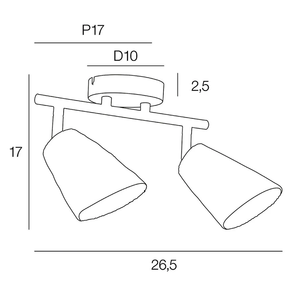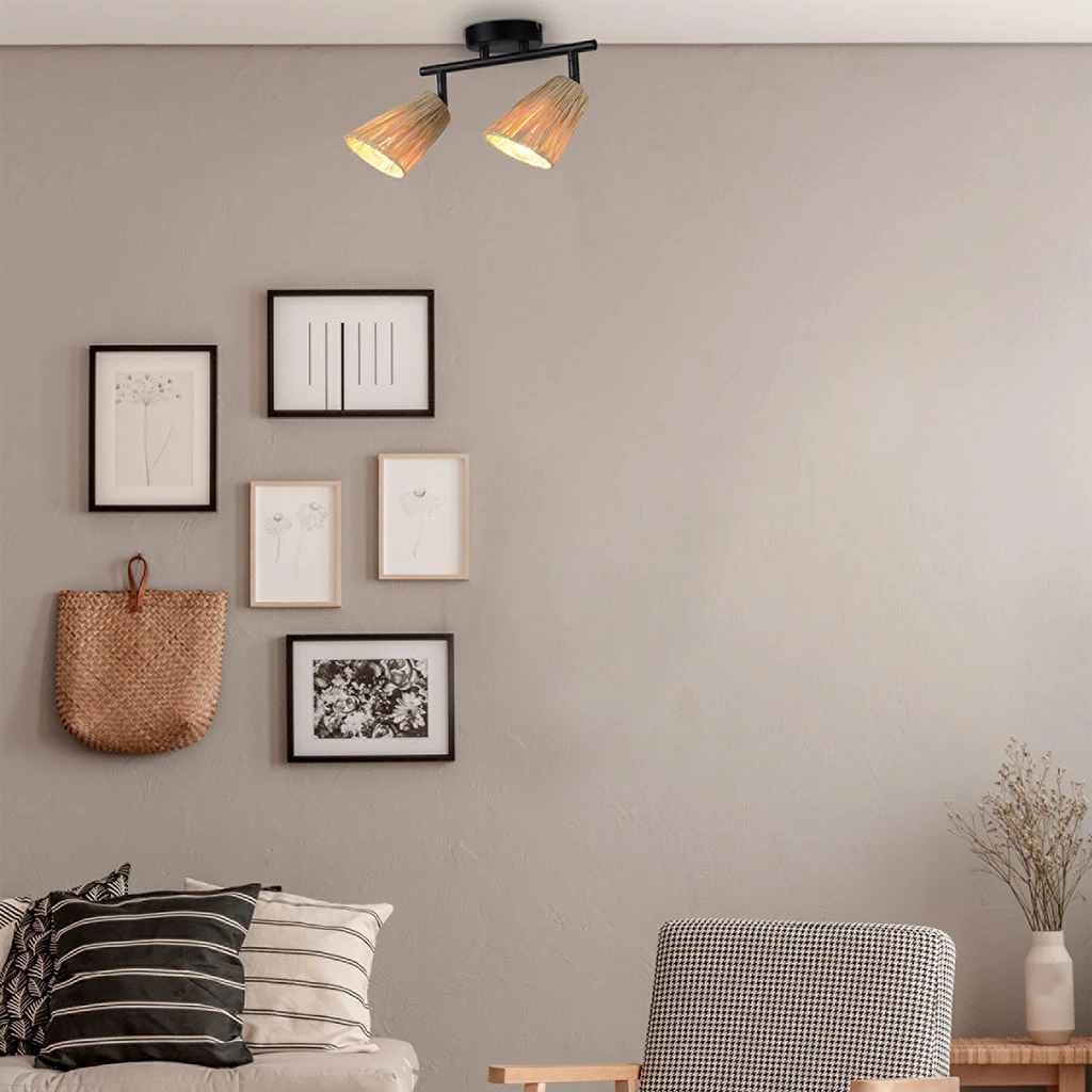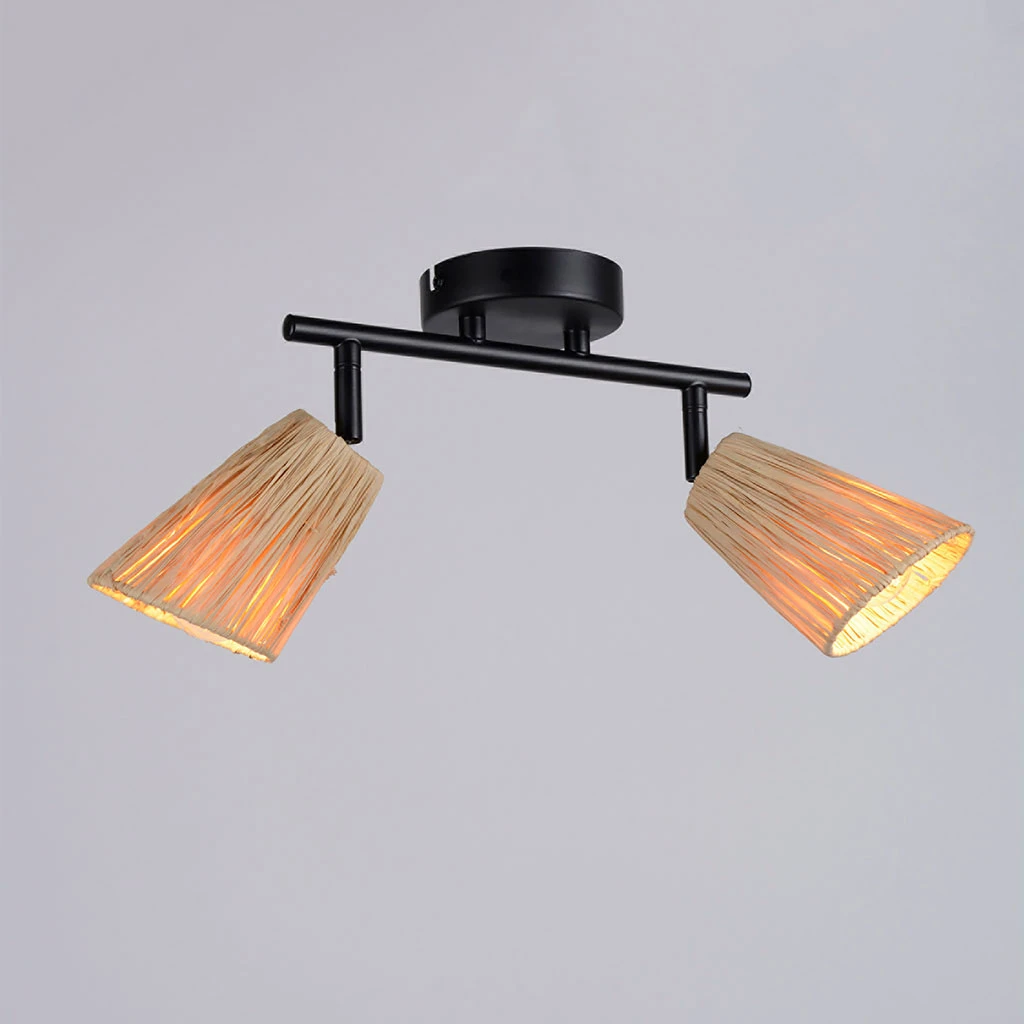 Spot 2 lumières base en métal peint. Abat-jour forme conique en raphia tressé à la main. Têtes orientables. Coloris : naturel. IP20. L26.5cm – P17cm – H17cm. Classe 2. E14-15W.