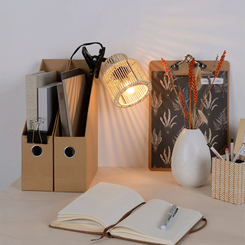 Spot à pince E14 avec câble, abat-jour en cordelette de papier tressé naturel. Tête articulée et pince en plastique. Coloris : naturel. IP20. D24cm – H21cm. Classe 1. E14-40W.