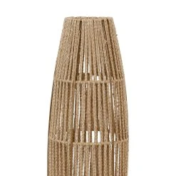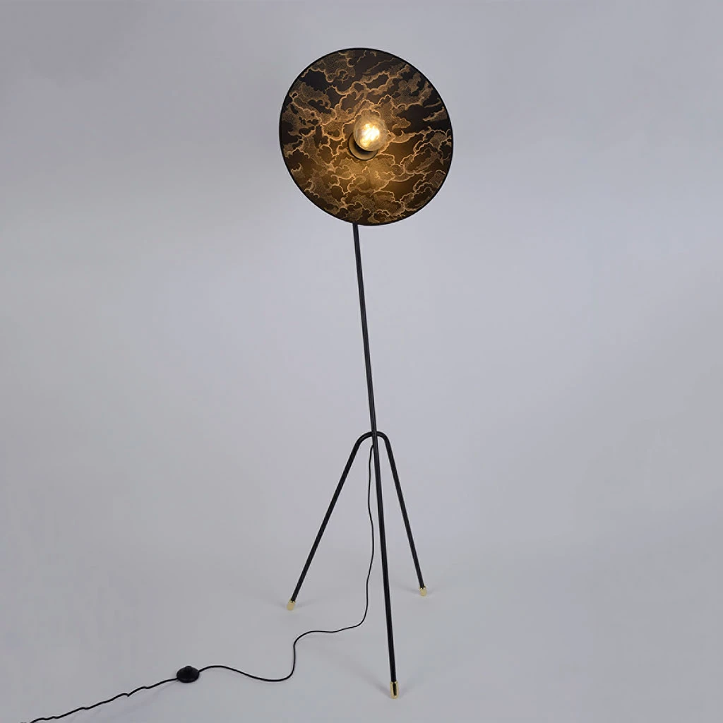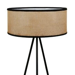 Lampadaire en métal peint finition sablée et détails laiton, forme trépied, orientable. Abat-jour conique bi-matière. Équipée d’un cordon textile et d’un interrupteur au pied. Coloris : kumo noir. IP20. L50cm – P59cm – H180cm. Classe 2. E27-60W.