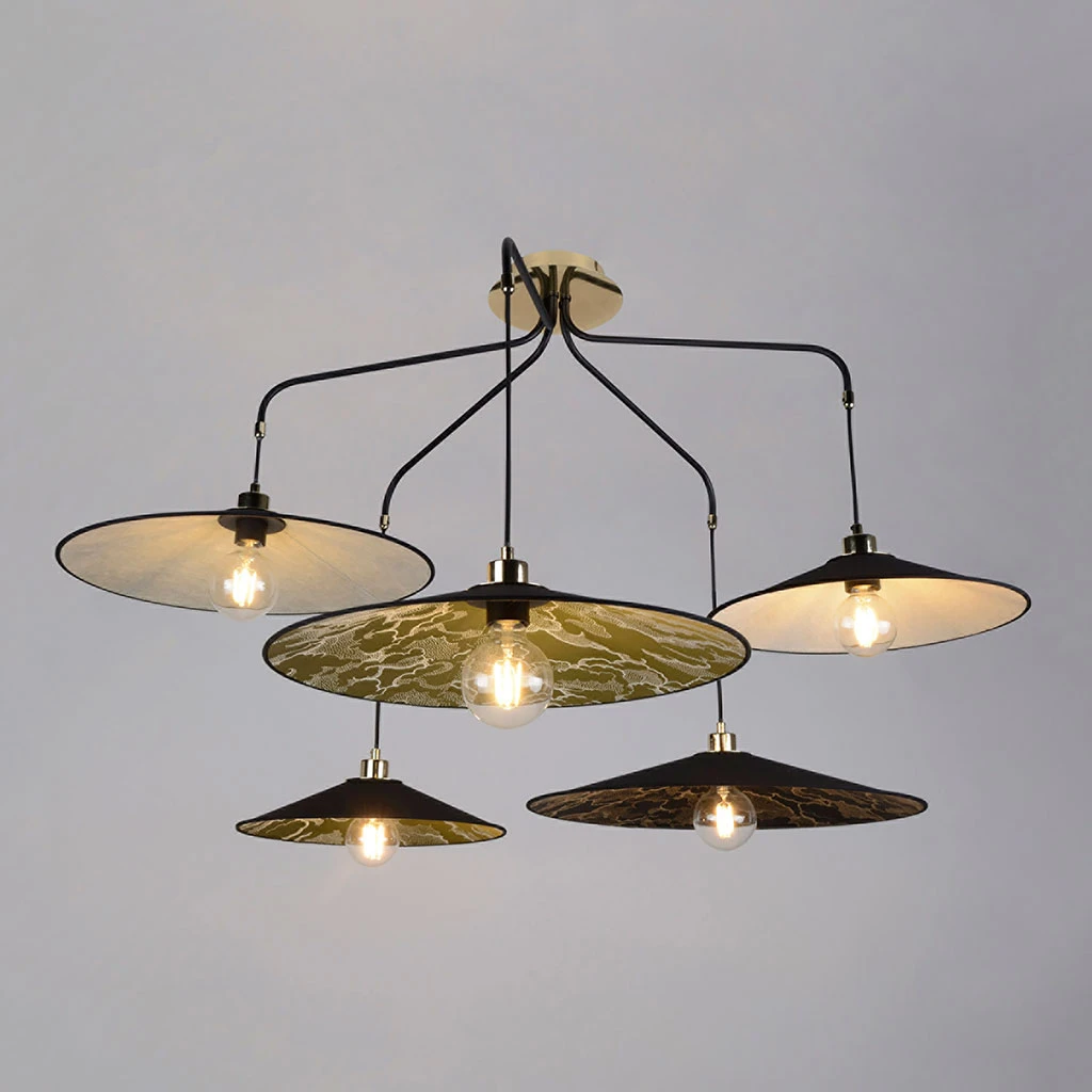 Plafonnier 5 lumières en métal peint finition sablé et détails laiton. Composé de 5 abat-jour de différents Ø, coloris et matières.