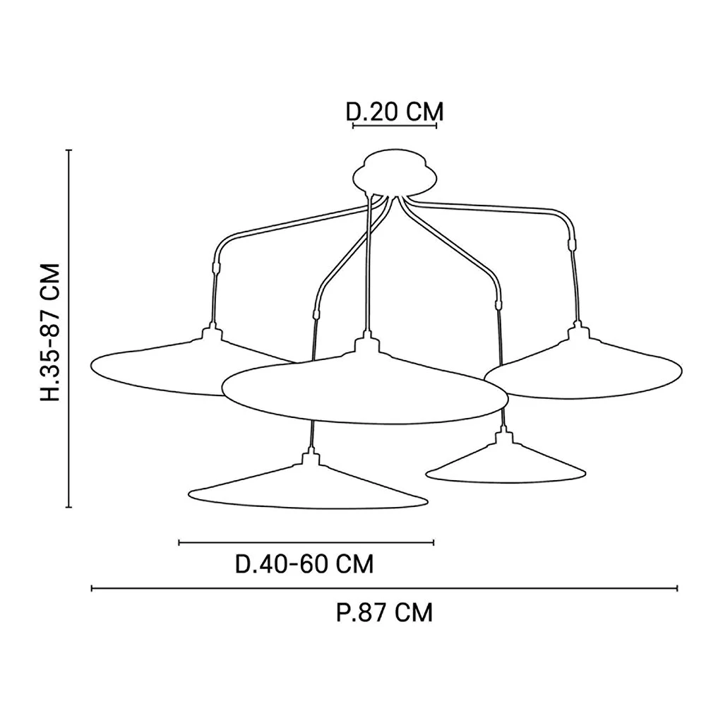 Équipé de 5 bras articulés, caches douilles en métal, de cordelières textiles et d’un pavillon en métal peint adaptable DCL. Coloris : assortis.