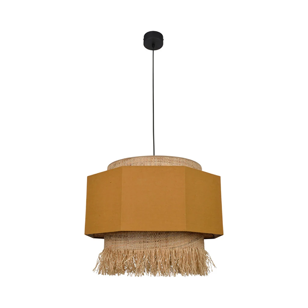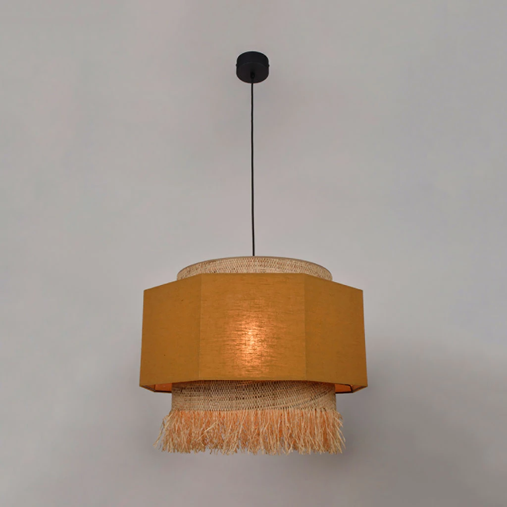 Suspension octogone empilement 3 abat-jour en lin lavé et cylindres en bana et raphia frangé. Equipée d’un cordon textile et d’un pavillon en métal assorti adaptable DCL. Ampoule E27 60 max non fournie.