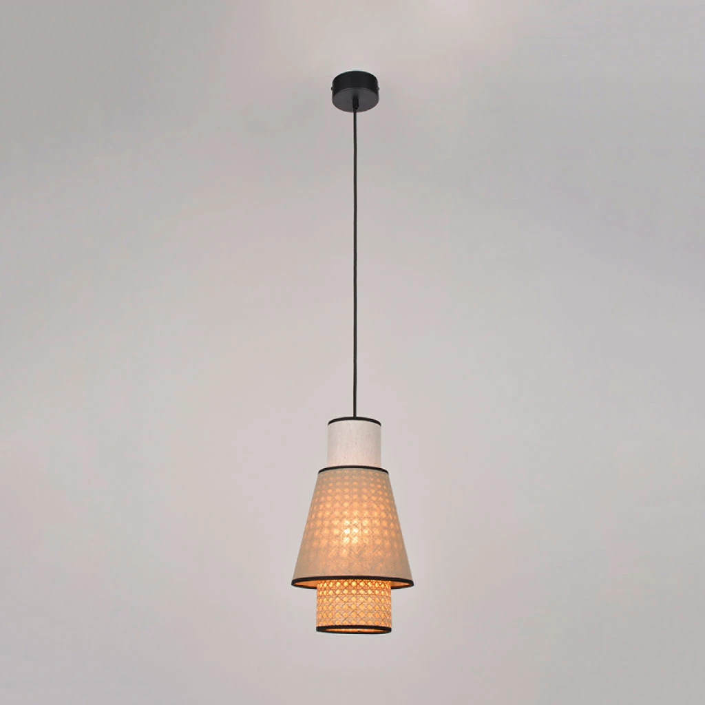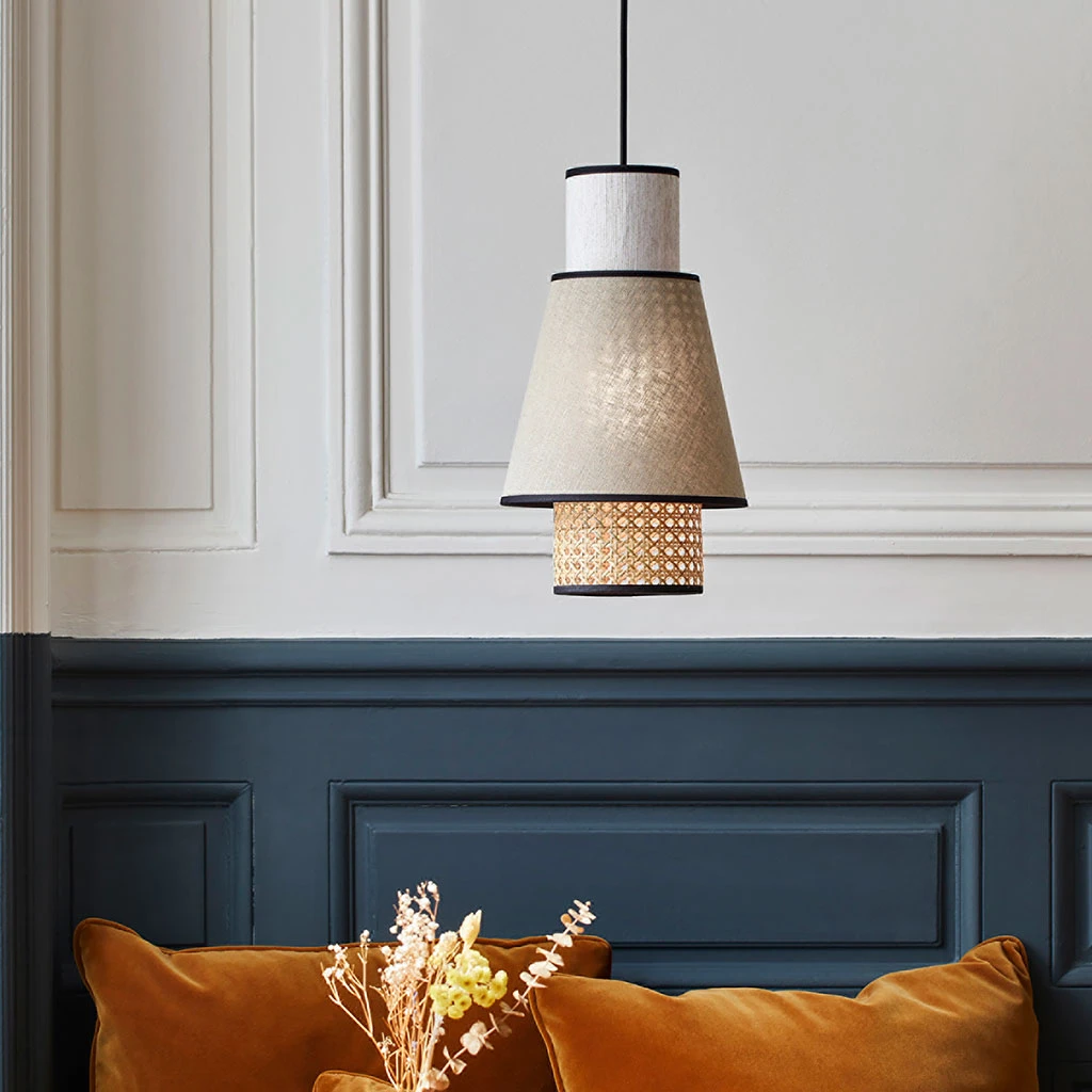 Suspension empilement de 3 abat-jour en lin lavé et cannage. Equipée d’un cordon textile et d’un pavillon en métal adaptable DCL. Ampoule E27 60W max non fournie.