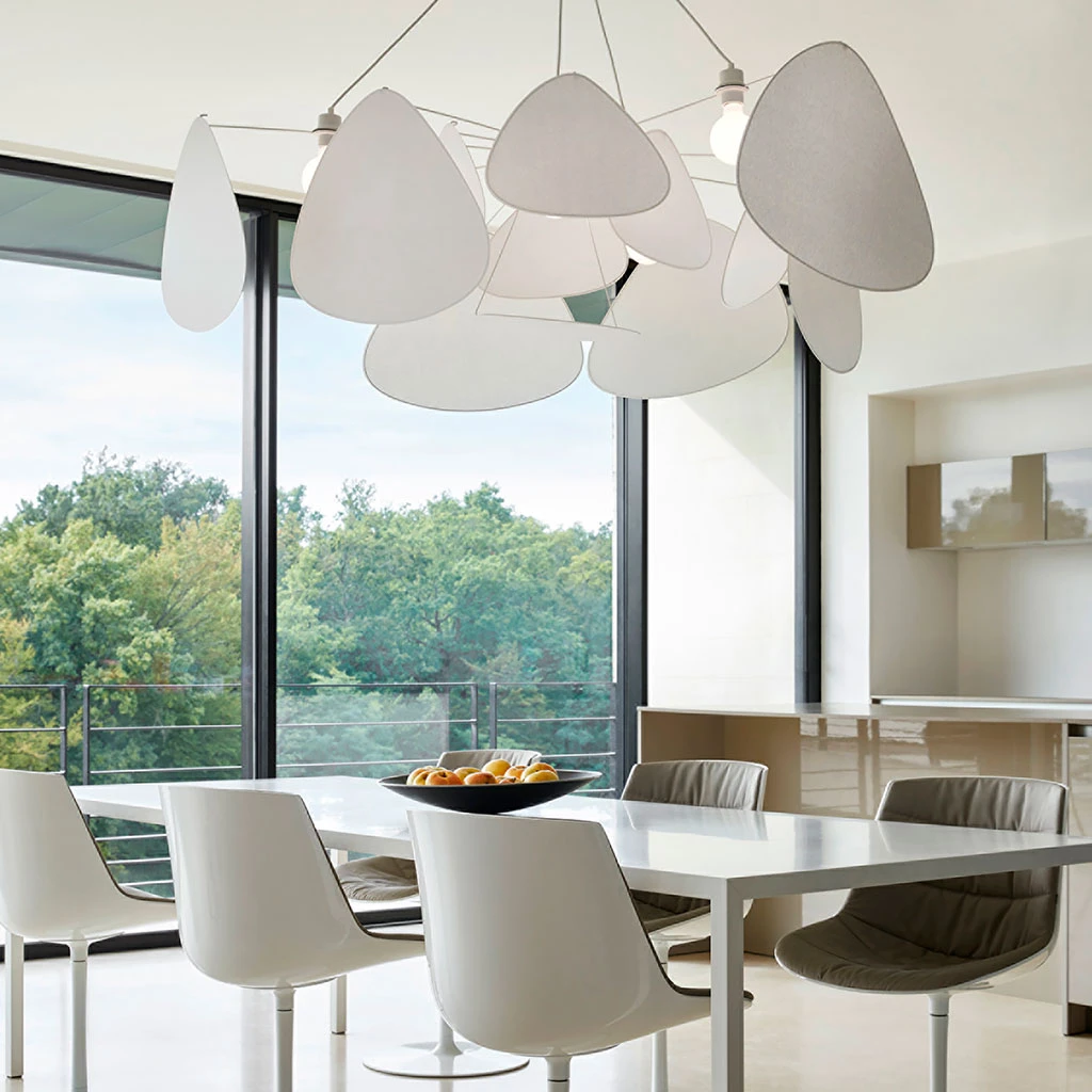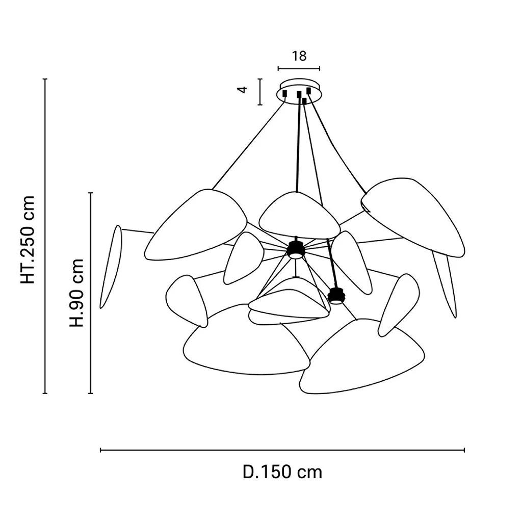 Suspension XXL esprit mobile. Structure en métal peint, 13 écrans en papier murano, fabriqués en France. Équipée d’une cordelière textile et d’un pavillon en métal adaptable DCL.