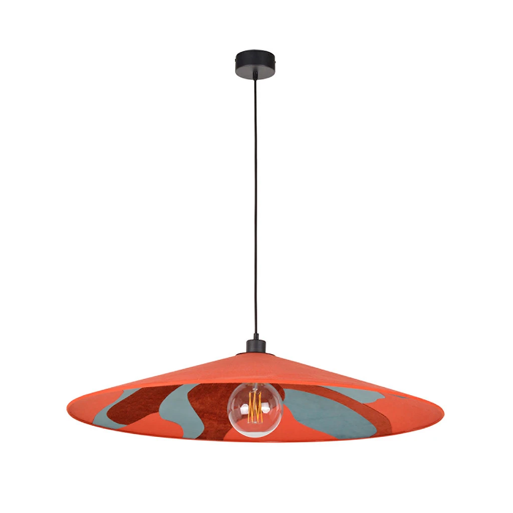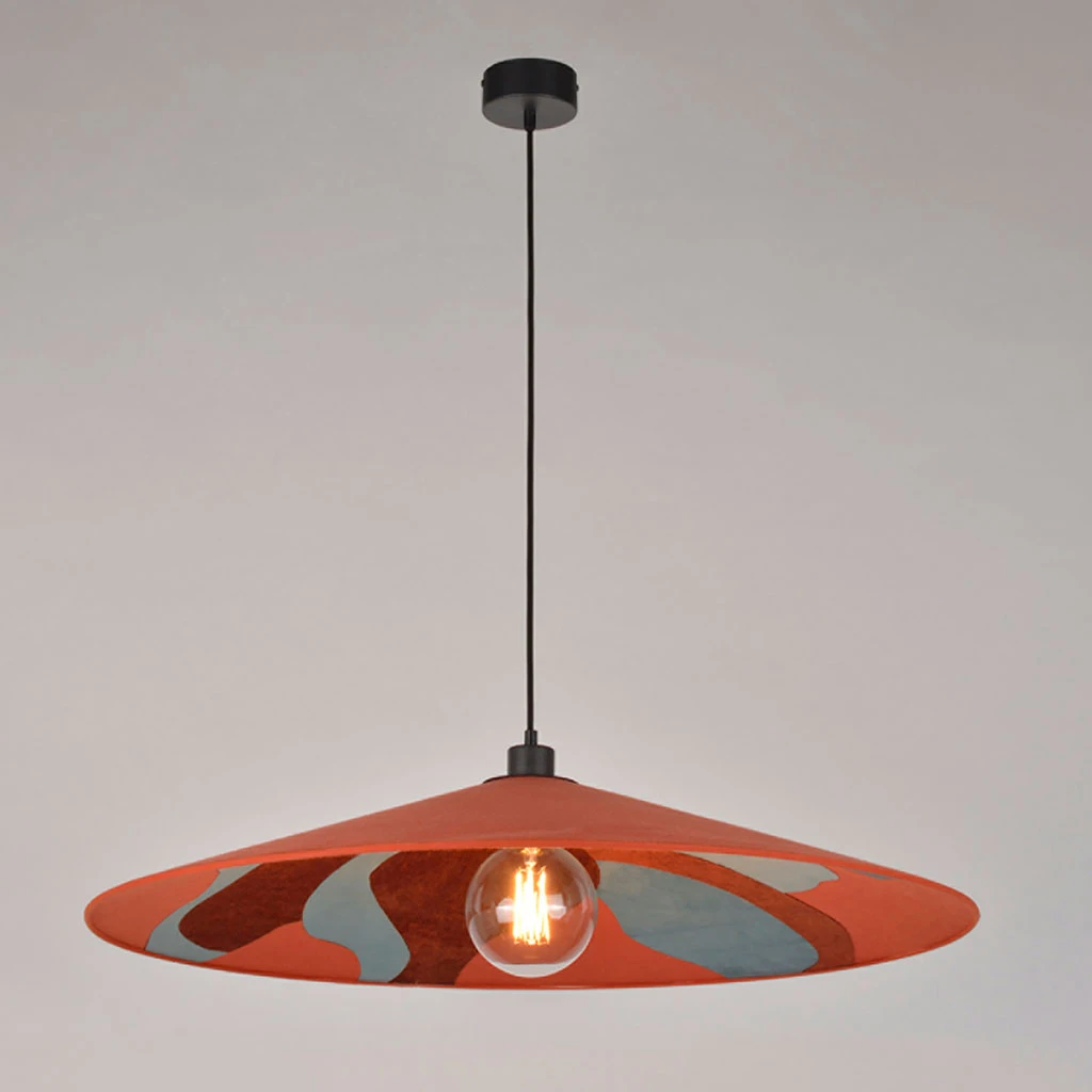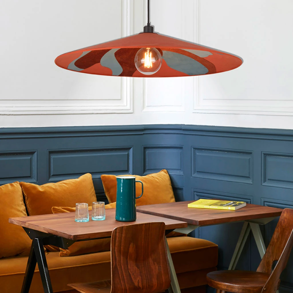 Suspension 1 lumière avec abat-jour conique bi-matière. Equipée d’un cordon textile et d’un pavillon en métal peint adaptable DCL. Ampoule E27 60W max non fournie.